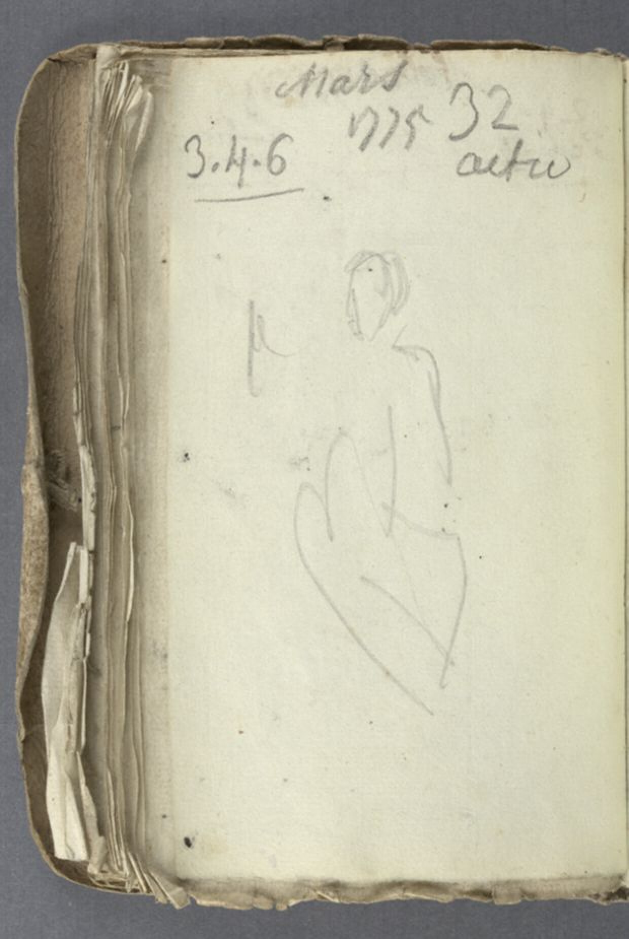 18de eeuw72ste bladzijde [blad 36, verso] uit een notitieboekje van Jan Garemijn als directeur van de Brugse Academie, daterend uit de schooljaren 1771-1772 en 1774-1775. Vluchtige en ruwe schets van een lichaam met hoofd. Er wordt een zittende positie gesuggereerd. De figuur is frontaal weergegeven. Wellicht houdt het model de rechterarm geheven. De schets is gemaakt in grijs potlood. Het gaat om de 32ste actie van het schooljaar 1774-1775, geposeerd op 3, 4 en 6 maart 1775.