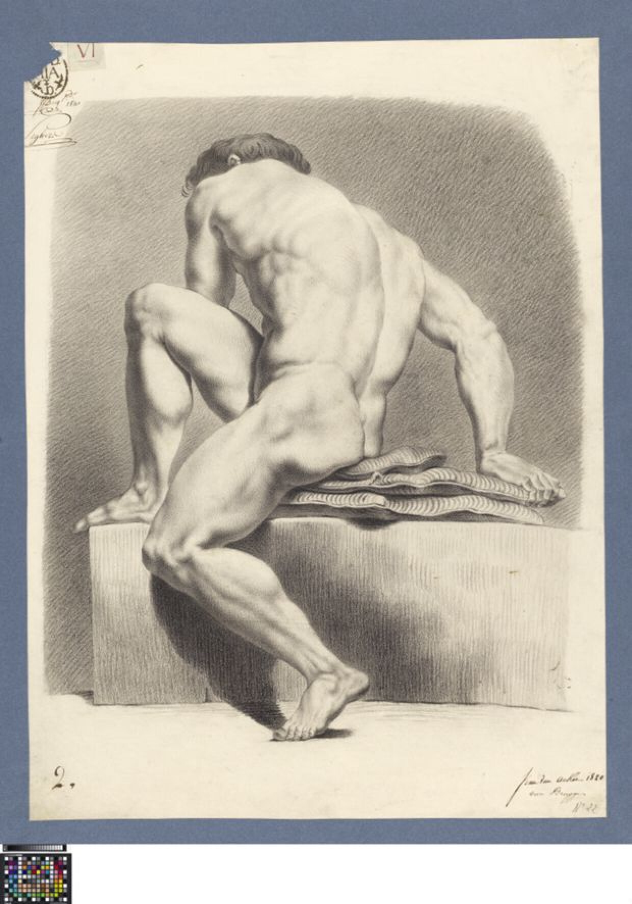 19de eeuwAcademische studie naar prent van een zittend mannelijk naakt, getekend door Jean Baptiste van Acker in 1820. van Acker was toen leerling de eerste klas naar prenten aan de Academie Brugge. Voor de wedstrijd om prijs maakte hij twee studies (zie ook 0016.GRO0142.23.II), waarmee hij de tweede prijs won. Leopold van Turnhout werd toen eerste (0016.GRO0142.20.II). Deze studie is gekopieerd naar een prent van een gespierde, naakte man die met zijn rug naar de tekenaar poseert. Het model zit op een sokkel met enkel gestapelde kussens. Hij houdt zijn rechterarm achter zijn lichaam en steunt op de kussens. Zijn linkerbeen is gebogen en hij rust met zijn voet op de sokkel. Het gebruikte medium is zwart krijt of houtskool. De aantekeningen duiden op van Ackers wedstrijddeelname. Zijn toegewezen tekennummer 'VI' staat geschreven op het papier etiket. Daarnaast is de academiestempel met handtekeningen van directeur Ducq en leraar Seghers te zien. Dat van Acker tweede werd, noteerde men linksonder. Nadien werd ook een aantekening met zijn naam en afkomst, en het wedstrijdjaar toegevoegd.