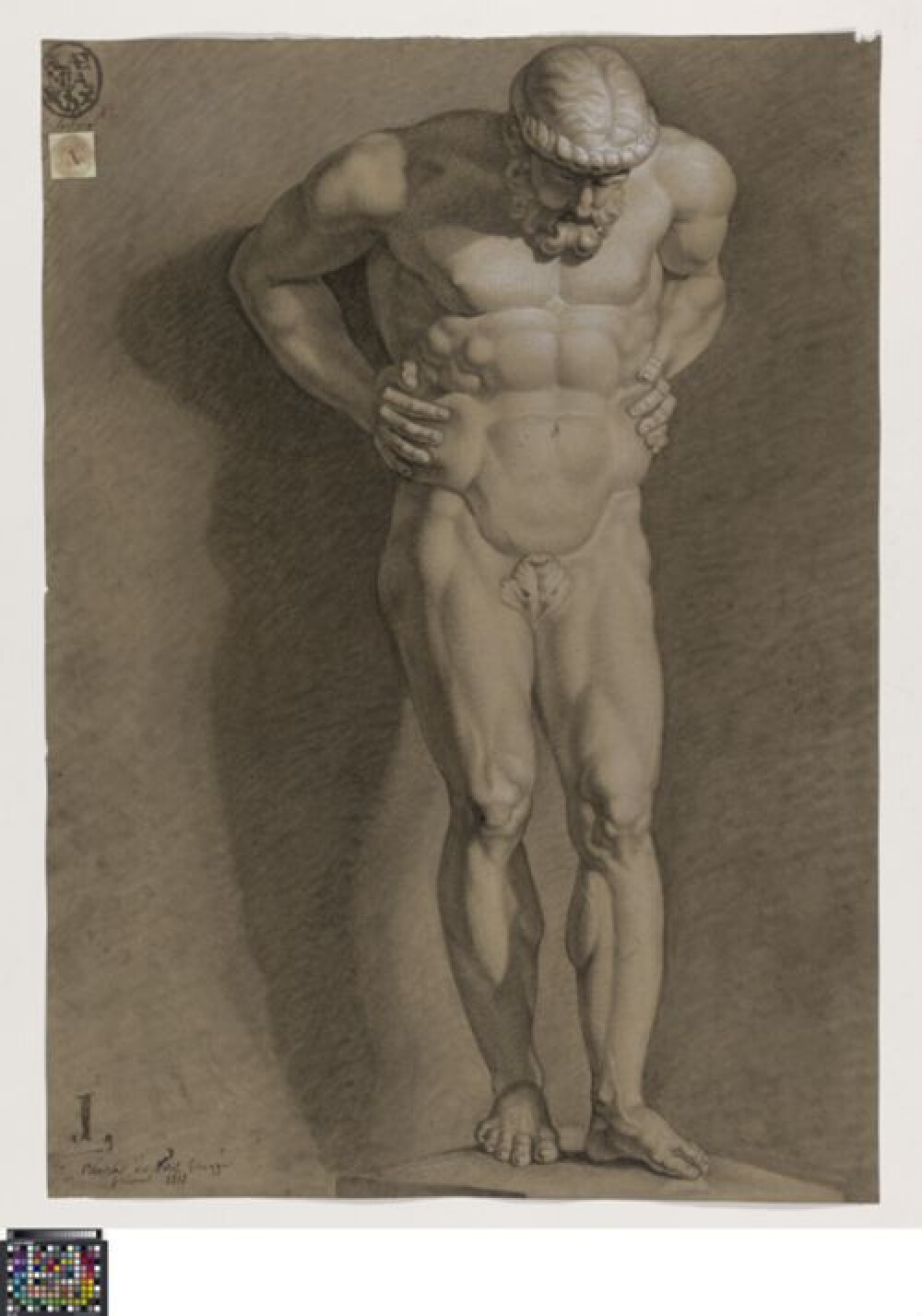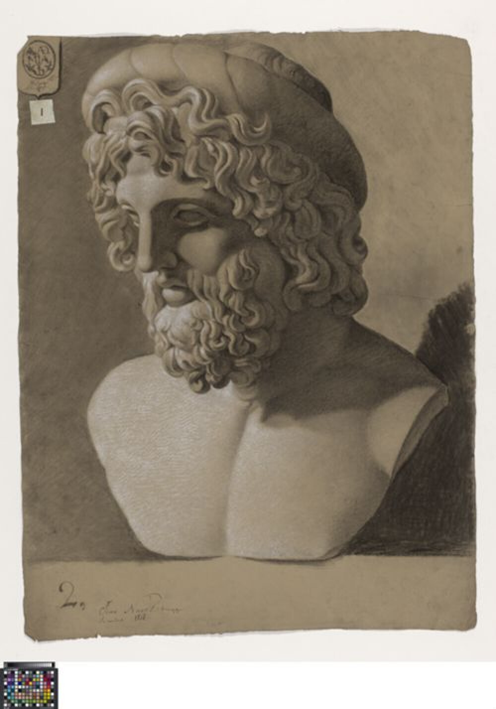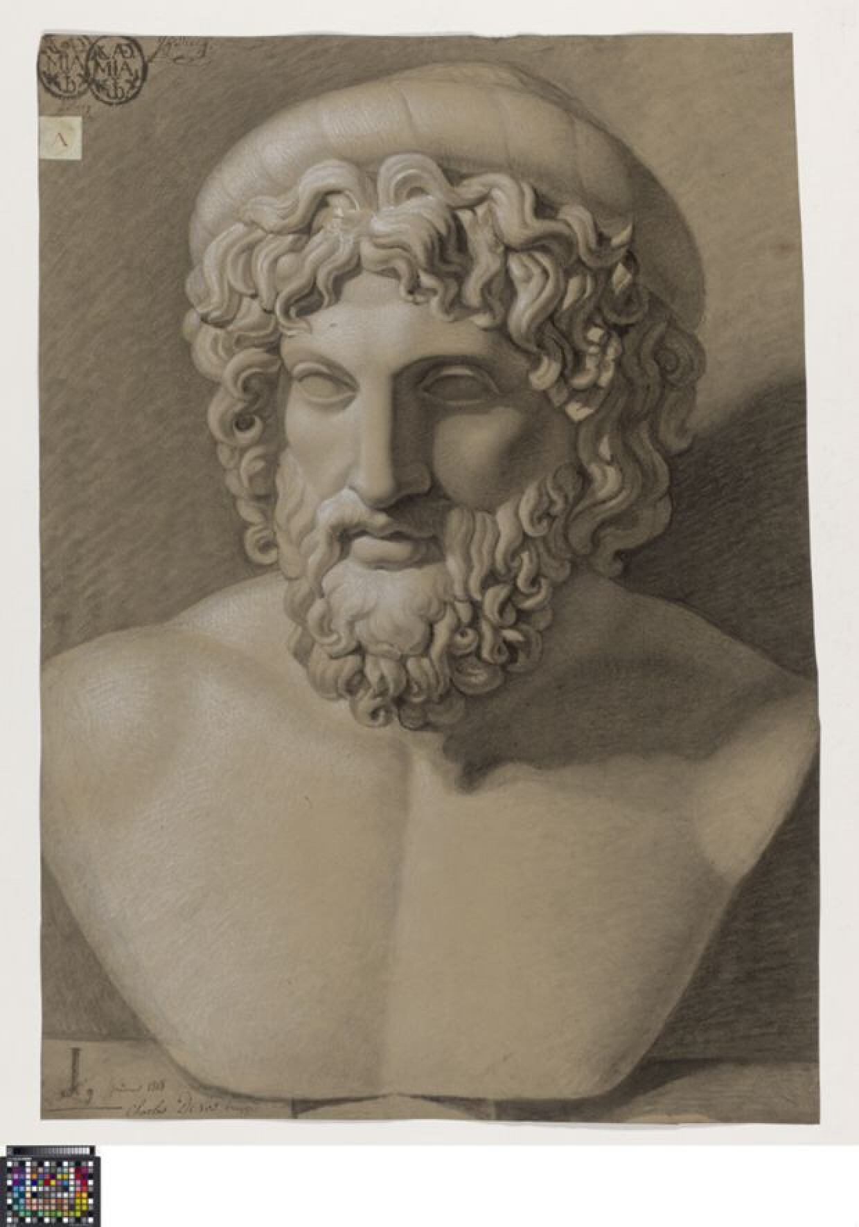 19de eeuwAcademische studie naar sculptuur van Asklepios, getekend door Charles De Vos in 1818. De Vos was toen leerling in de klas naar plaaster aan de Academie Brugge. Voor de wedstrijd om prijs maakte hij twee studies (zie ook 0016.GRO0165.II), waarmee hij primus van zijn klas werd. Jean Naert werd secondus (0016.GRO0166.II). Een buste van Asklepios is frontaal getekend. De Griekse god is weergegeven met krullend haar en een volle baard. Hij draagt een brede, ronde hoofdband. Vermoedelijk tekende De Vos naar een afgietsel van een Romeinse buste dat vandaag in het Louvre bewaard wordt. Deze buste zou een kopie zijn naar een Grieks origineel, wellicht van beeldhouwer Timotheos. De studie is gemaakt in zwart krijt of houtskool, gehoogd met wit krijt. De aantekeningen duiden op De Vos' wedstrijddeelname. Op het etiket staat zijn toegewezen tekenletter 'A'. Daarboven zijn de academiestempel en handtekening van directeur Ducq te zien. Beide elementen zijn tweemaal aangebracht. Dat De Vos de eerste prijs behaalde, werd linksonder met een 'J,' (of 1,) genoteerd. Nadien werden ook zijn naam en afkomst, wedstrijdtitel en het wedstrijdjaar onderaan opgeschreven.