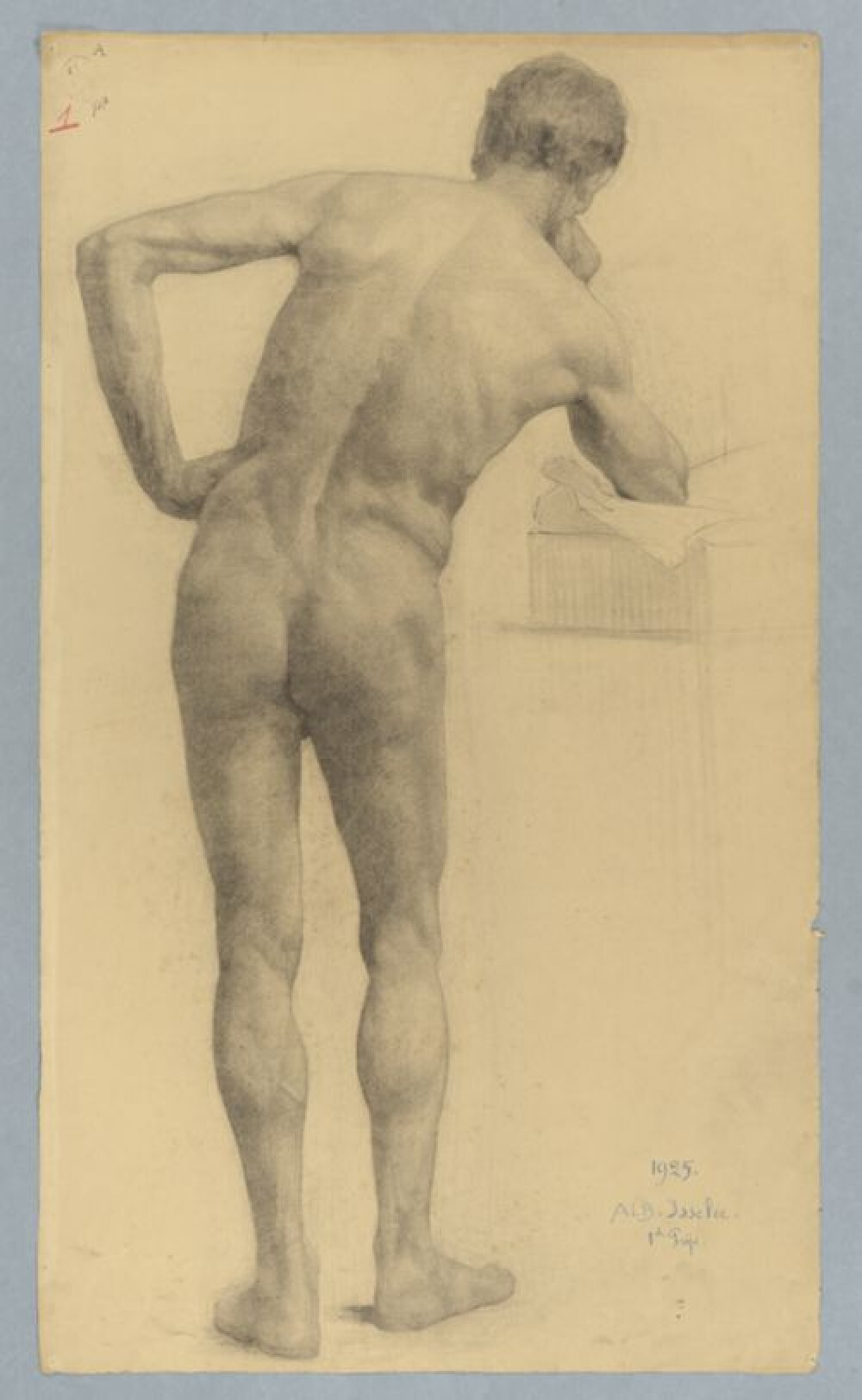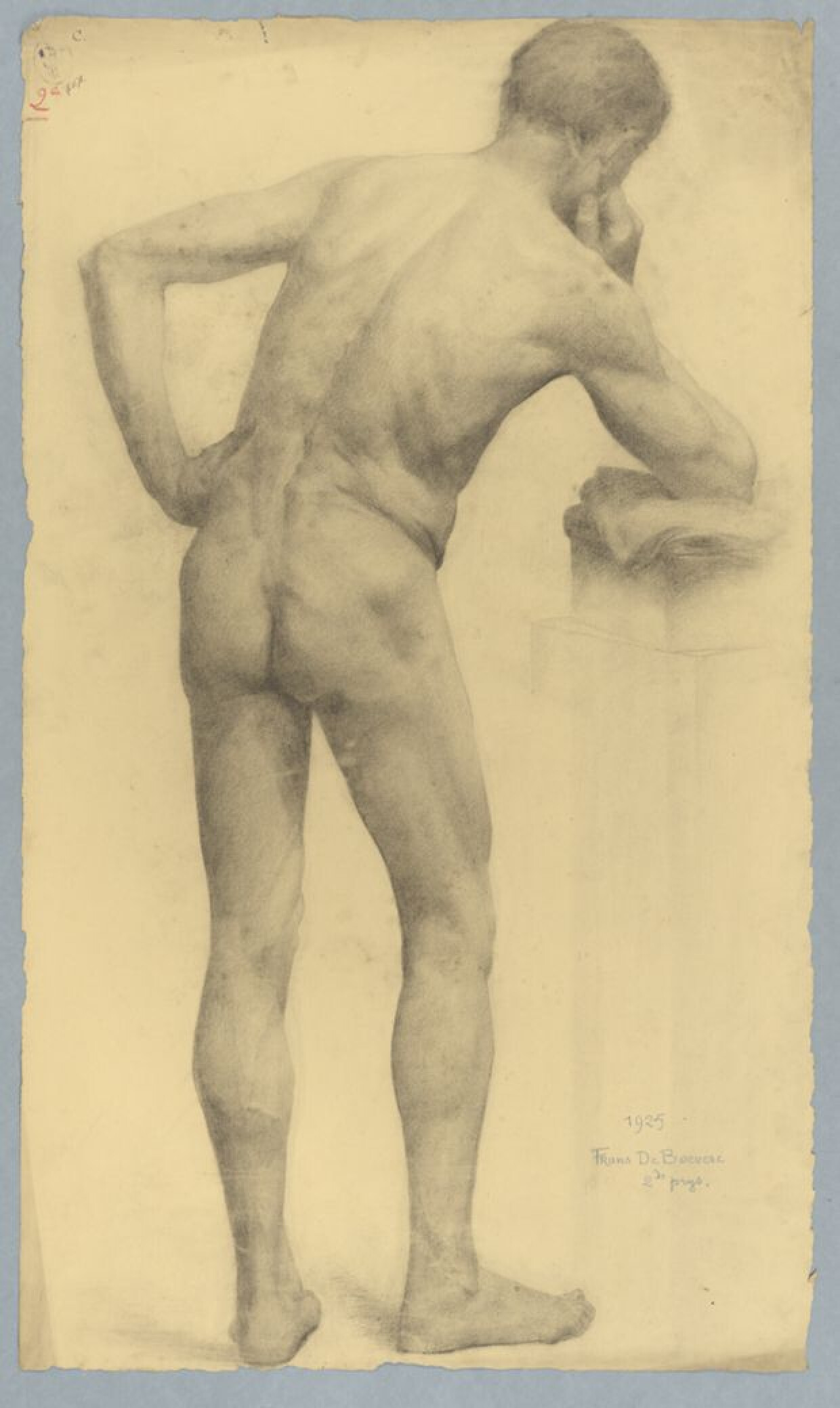Academische studie naar levend model, getekend door Frans De Bouvere in 1925. Met deze studie werd hij tweede in een wedstrijd binnen de klas 'Tekenen naar het leven' aan de Brugse academie. De initialen bovenaan verwijzen naar de leerkracht, Flori Van Acker (tevens directeur). Het naaktmodel is staand afgebeeld vanuit de rugzijde. Hij leunt naar rechts, waarbij zijn gebogen rechterarm steunt op een steun en zijn hoofd rust tegen de gesloten hand. De gebogen linkerarm is geplaatst op zijn zij. De achtergrond van de tekening is niet ingevuld. Het medium is zwart krijt of houtskool op papier.