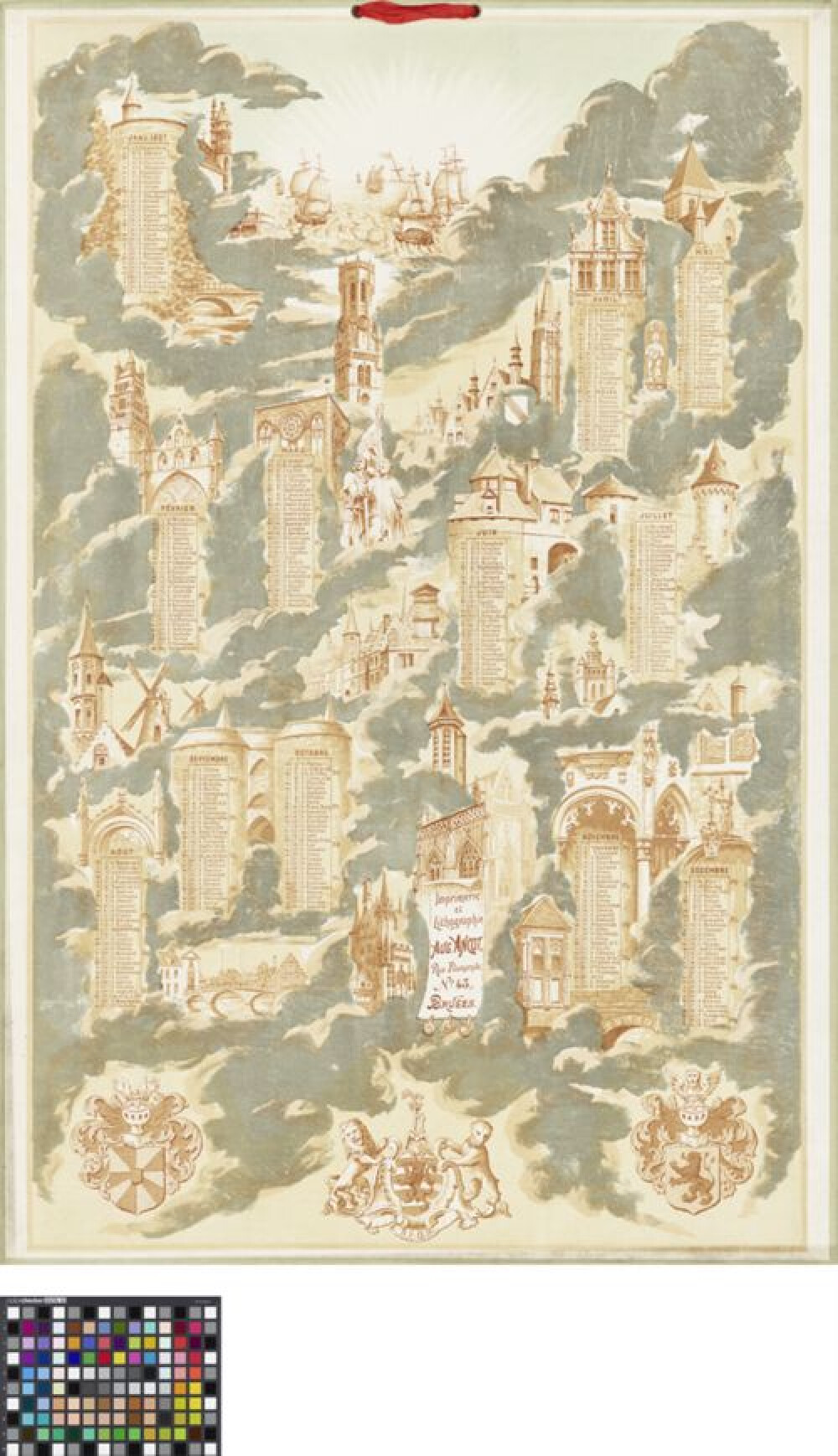 19de eeuwKalender voor het jaar 1897 met elke maand afzonderlijk opgelijst. In de eerste kolom de eerste letter van de weekdag, de 'D' van 'Dimanche' steeds in vetjes. In de tweede kolom de dag van de maand. In de derde kolom tenslotte de heilige die op die dag wordt gevierd. Naast de kolom staat de maancyclus aangeduid met 'NL' (nouvelle lune), 'PC' (premier croissant), 'PQ' (premier quartier) en 'PL' (pleine lune). Deze maandtabellen zijn in een wolkenmassa opgenomen en worden afgewisseld met Brugse bezienswaardigheden. Met wijzerzin, te beginnen van boven: een zeezicht met zeilschepen verlicht door de stralen van de ondergaande op opgaande zon. De toren van de Sint-Gilliskerk. Het Brugs Beertje in de nis van de Poortrersloge. De geveltop van de Griffie van het Brugse Vrije. De Onze-Lieve-Vrouwekerk en de spitse torentjes van het Brugse Vrije met het wapenschild van het Brugse Vrije. De Ezelpoort. De torentjes van het Boterhuis. De toren van de Jeruzalemkerk. De top van de Sint-Joristoren. Toren van het Oosterlingenhuis. Het tolhuis. Het paradijsportaal van de Onze-Lieve-Vrouwekerk. De toren van de Poortersloge (?). De erker van het huis van Herman van Outvelde aan de Vlamingbrug. Het stadhuis. De brug naar het begijnhof. De kruispoort. Het torentje van de Sint-Sebastiaansgilde met de op de achtergrond twee molens aan de vesten. De achterkant van de huizen aan het huidenvettersplein gezien vanaf de Dijver. Het standbeeld van Jan Breydel en Pieter de Coninck. Huis Boechoute. Het belfort of de halletoren. De Sint-Salvatorskathedraal. De Poertoren en de boogbrug over het minnewater. De toren van de Kapel van het Heilig Bloed. Onderaan zijn de wapens afgebeeld van de provincie West-Vlaanderen, de stad Brugge en Vlaanderen. De kalender werd gedrukt en uitgegeven door de Brugse firma Ancot. Bovenaan zijn twee gaatjes aangebracht voorzien van een metalen ringetjes. Door de gaatjes een rood lint om de kalender op te hangen.