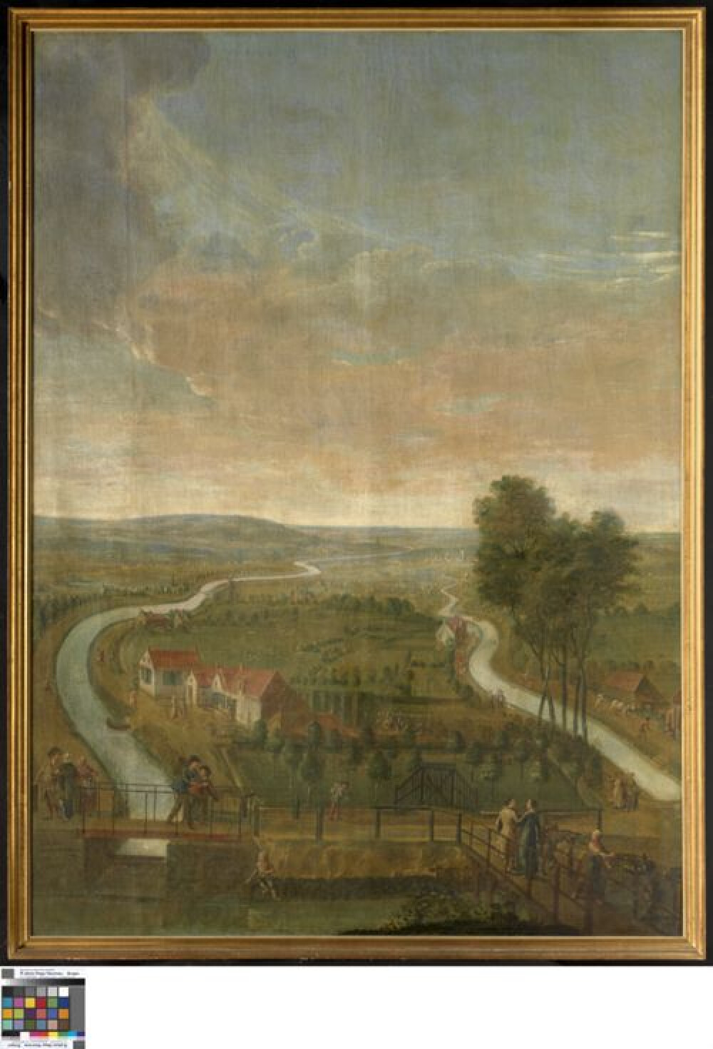 19de eeuw 18de eeuwDeel van een reeks salonstukken met gezichten op Brugge en omgeving. Dit schilderij vormt een onderdeel van drie taferelen die samen de Brugse havenkom voorstellen, van de Ezelpoort tot aan de Dampoort. Hier wordde scheepswerven in de buurt van Fort Lapin voorgesteld. Op de achtergrond is de kerk van Dudzele te zien.