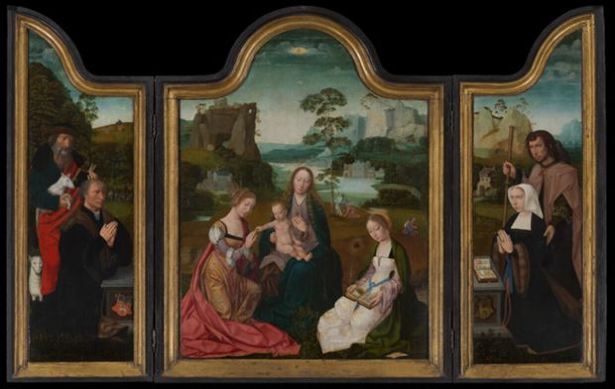 16de eeuwHet hoofdtafereel van deze triptiek is een eerder uitzonderlijke combinatie van een 'Rust tijdens de vlucht naar Egypte' en een 'Virgo inter Virgines'. De zittende Madonna met Kind is vergezeld van de heilige Catharina, die de symbolische ring als bruid van Christus aangereikt krijgt, en de heilige Barbara, met een pauwenveer. Op de achtergrond centraal zijn drie engelen vijgen aan het plukken, rechts stapt Jozef op weg naar Maria. Achter Catharina is haar marteling met het rad en de hemelse bliksem voorgesteld; achter Barbara zien we een herder die haar schuilplaats aan haar vader verraadt en haar vader die haar in de grot bedreigt. De zijluiken bevatten portretten van de stichters Joachim Christiaans, redenaar van de Proosdij te Brugge, en zijn tweede vrouw Jossine Lamsins, respectievelijk beschermd door de heilige Joachim en de heilige Judocus. Uit onderzoek blijkt dat het portret van de man geschilderd is over een ouder portret van Jan van Cattenbrouck, de eerste man van Jossine Lamsins, wiens beschermheilige Johannes gewijzigd is in Joachim. In gesloten toestand vertoont de triptiek een 'Annunciatie' in grisaille op een rode gemarmerde achtergrond.