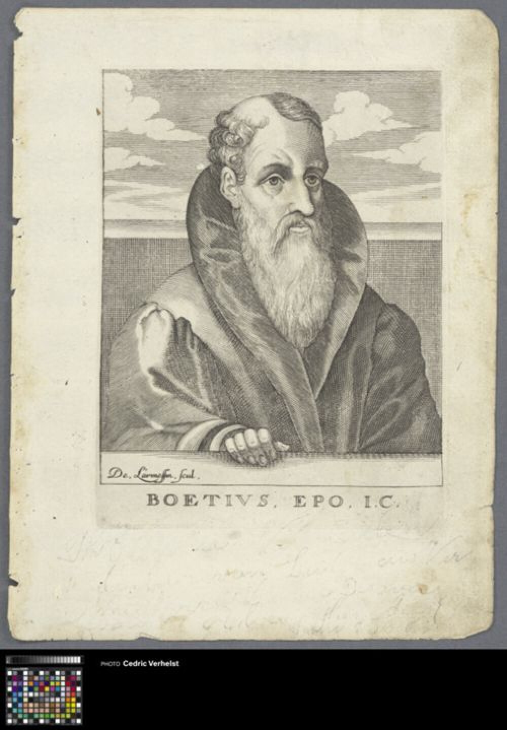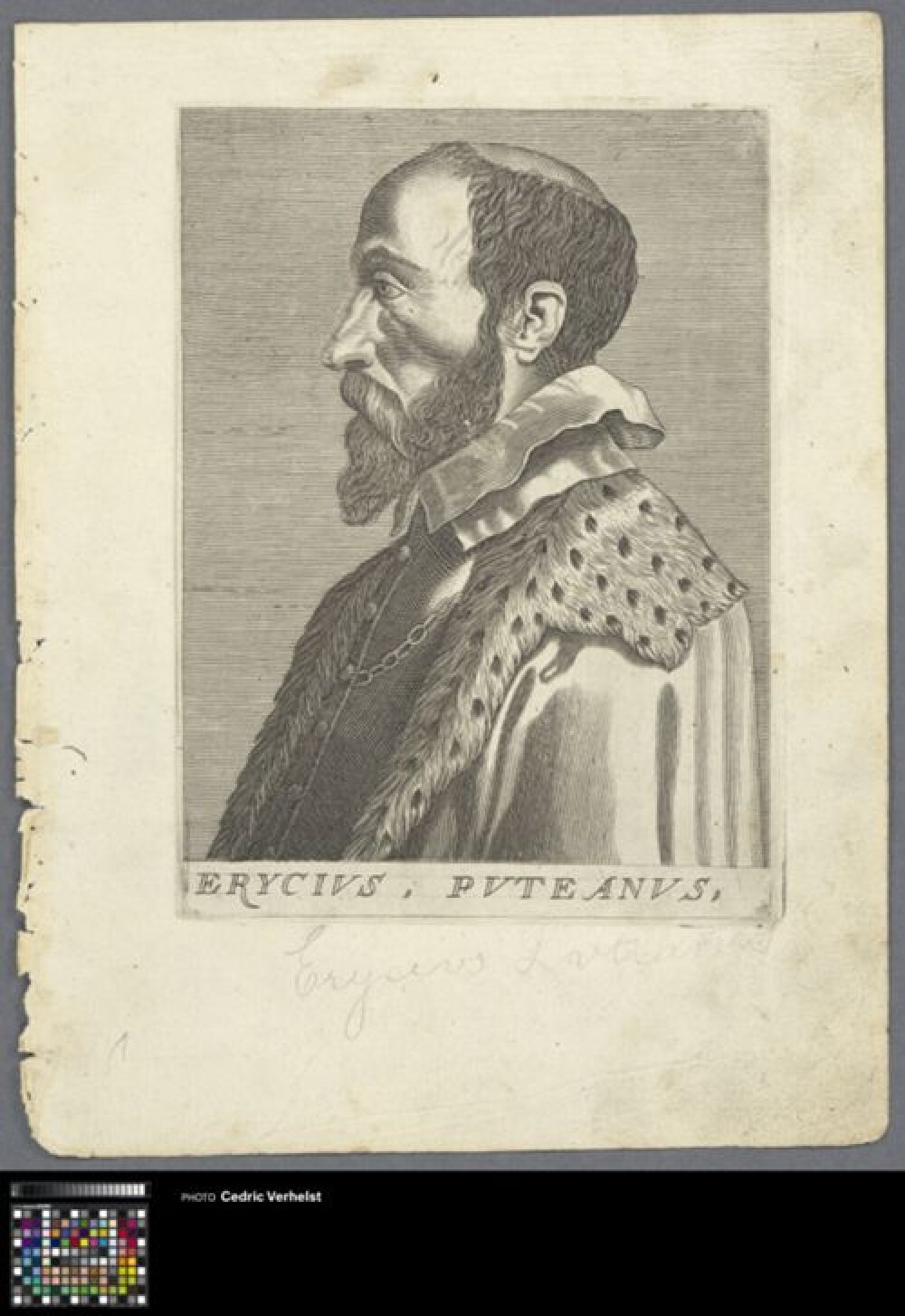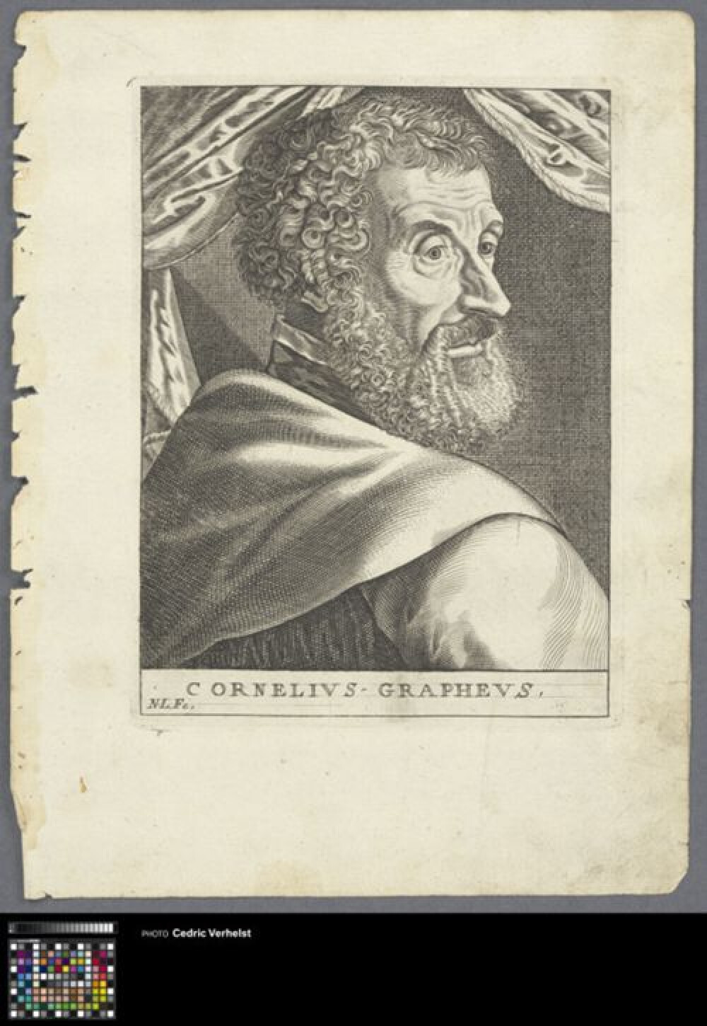 17de eeuwPortret van Baltasar Moretus I, drukker en hoofd van de drukkerij Platijn in halffiguur naar links. Boekillustratie uit: Bullart, Isaac. Académie des Sciences et Arts contenant les vies et éloges his. des hommes illustres qui ont excellé en ces professions depuis environ quatre siècles. Brussel: François Foppens, 1682. Aantekening in potlood op achterzijde.