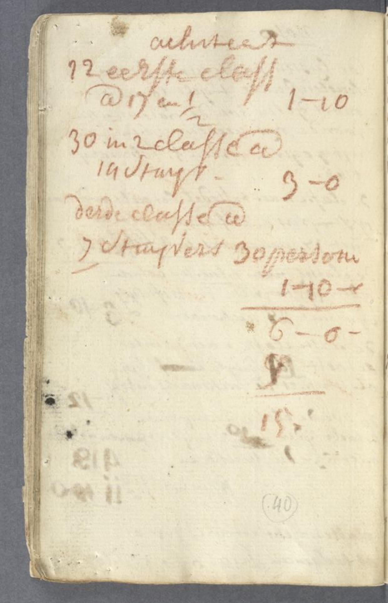 18de eeuwVeertigste bladzijde [twintigste blad, verso] uit een notitieboekje van Jan Garemijn als directeur van de Academie Brugge, daterend uit het schooljaar 1767-1768. Deze pagina bevat een kladversie van de rekening die op bladzijde achtendertig te zien is. De meeste bedragen komen overeen, behalve van de derde klas. Wellicht heeft Garemijn beslist de bijdrage van de leerlingen in deze klas te verhogen.