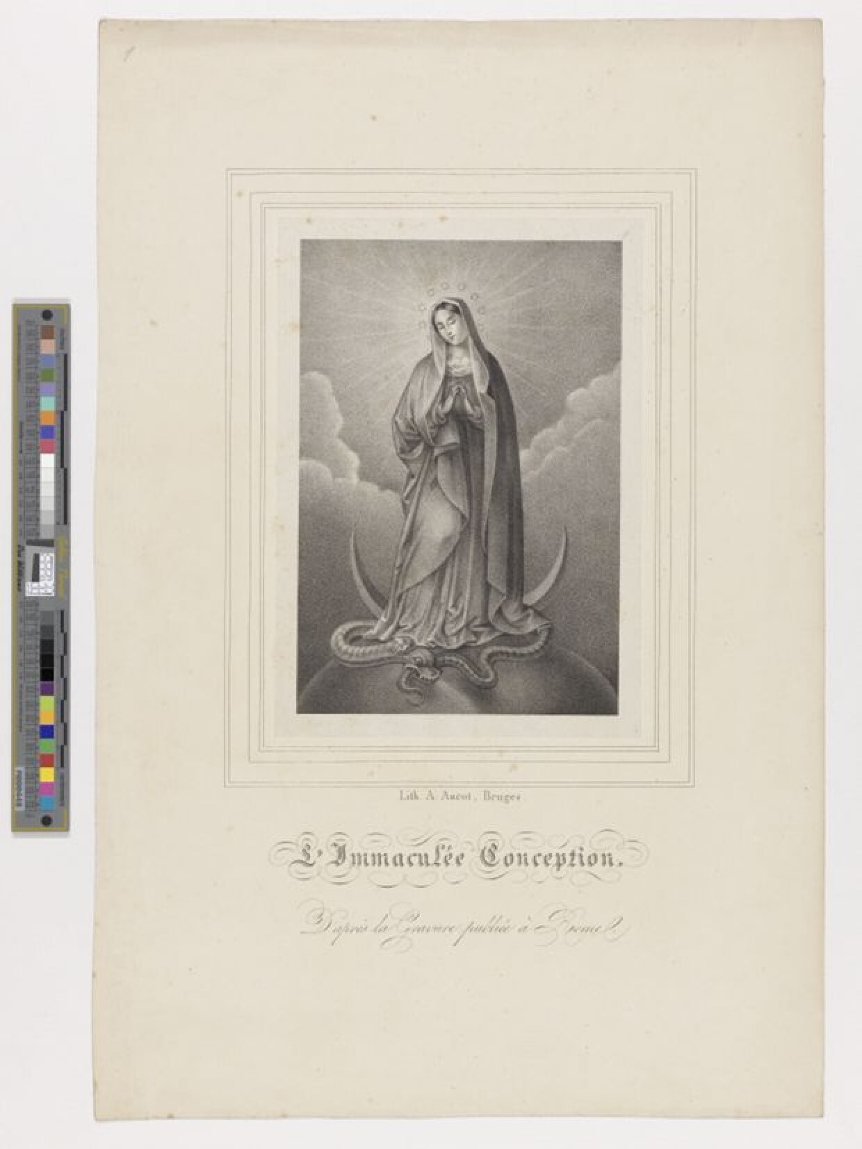 19de eeuwEen gesluierde Madonna is voorgesteld tussen de wolken, staande op een bol met halve maansikkel, terwijl ze een slang vertrapt. Deze prent werd in Brugge gedrukt door Auguste Ancot, naar een in Rome gerealiseerde gravure.