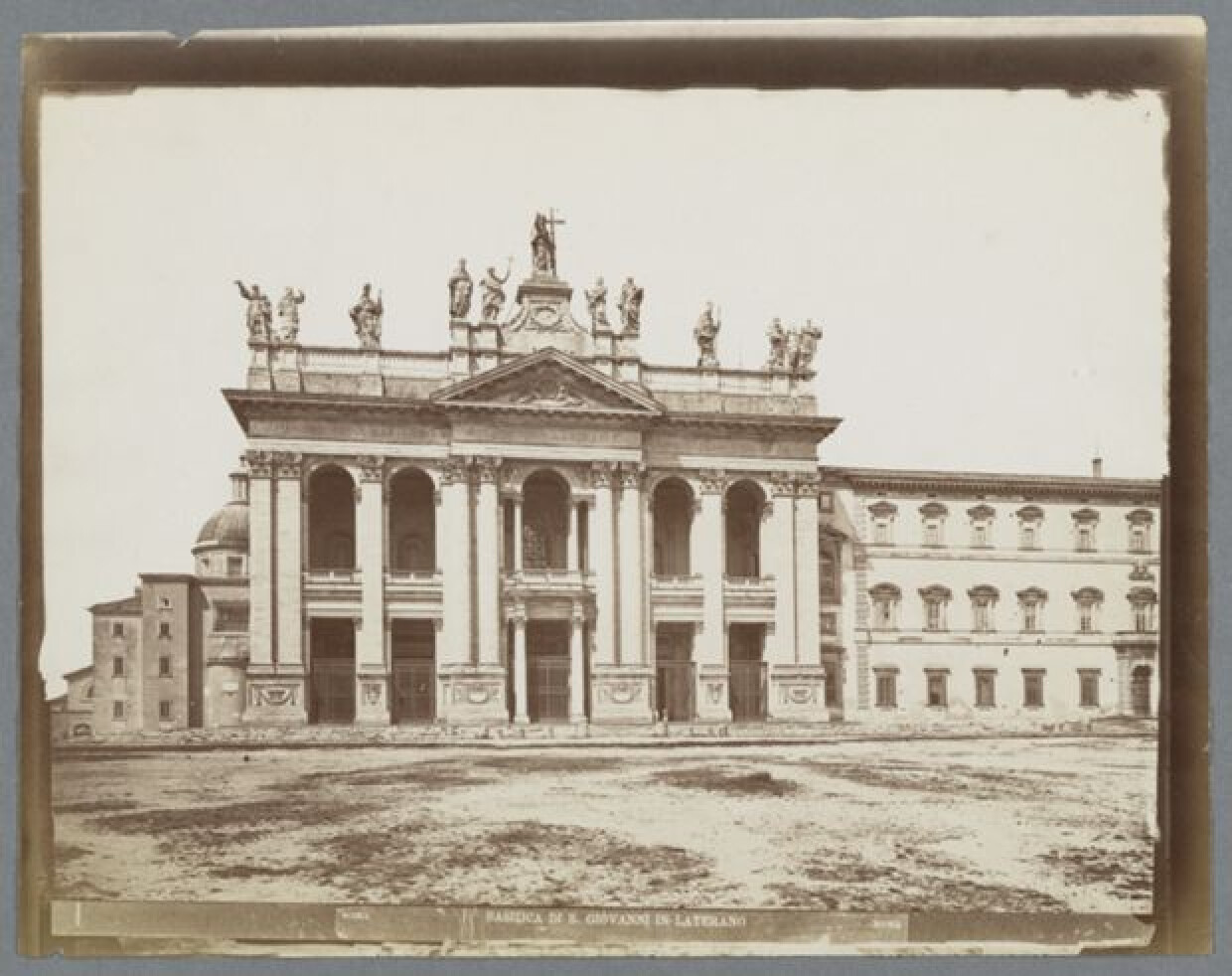 Deze fotografische afdruk beeldt de Pauselijke Aartsbasiliek van Sint-Jan van Lateranen af in Rome. De monumentale voorgevel van de basiliek staat centraal in beeld. Links ervan is een deel te zien van het aangrenzende klooster. Aan de rechterkant zien we een deel van het Palazzo Lateranese. In de twee deur van de basiliek, vanaf rechts, staan een zuster en een man (geestelijke?) te praten. Deze afdruk is deel van een reeks albuminedrukken van de Napolitaanse fotograaf Achille Mauri en andere 19de-eeuwse fotografen.