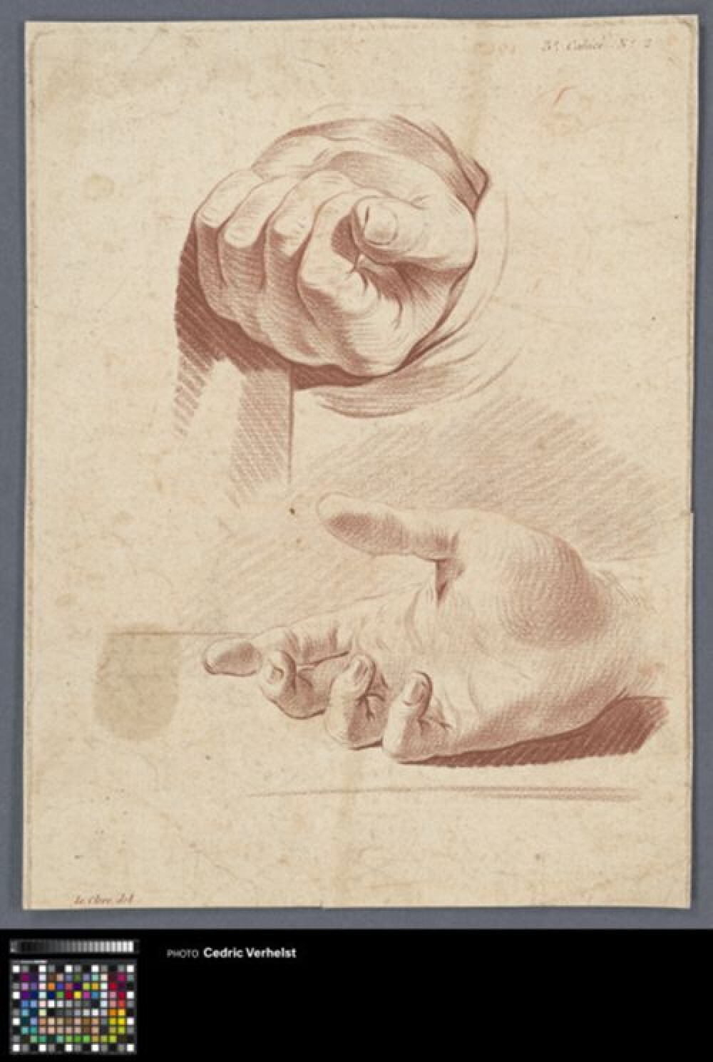 18de eeuwTweede plaat van derde boek in de uitgave 'Cahier de principes de dessein d'après nature'. van Le Clerc. De prenten zijn telkens uitgewerkt in de crayonmanier. De voorstelling toont twee handen. De bovenste hand maakt een vuist en is afgebeeld in raccourci. De onderste ligt op een oppervlak en is langs zij afgebeeld. De hand is open en de vingers zijn licht geplooid.