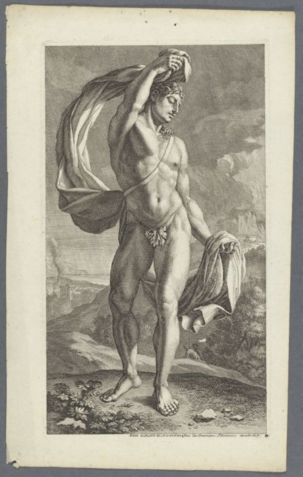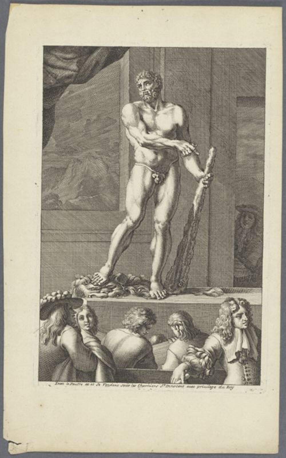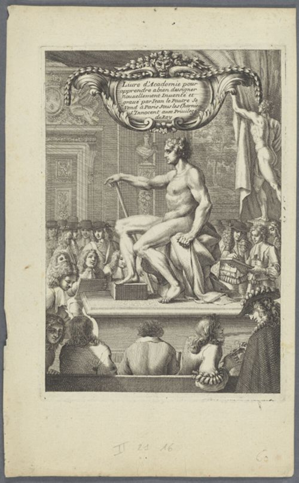 17de eeuwPrent uit de reeks "Livre d'Academie pour apprendre a bien dessigner", gegraveerd en uitgegeven door Jean Lepautre. De gravure toont een poseersessie, wellicht in de Académie royale de peinture et de sculpture, in 1648 opgericht door Lodewijk XIV. Het naaktmodel staat op een podium en poseert in contrapost. Hij draagt een lendendoek en kijkt in profiel naar rechts. Achter het model zijn er enkele studenten afgebeeld terwijl ze schetsen. De figuur linksonder houdt een buste vast. Verder hangen er twee schilderijen tegen de wand achter de studenten.