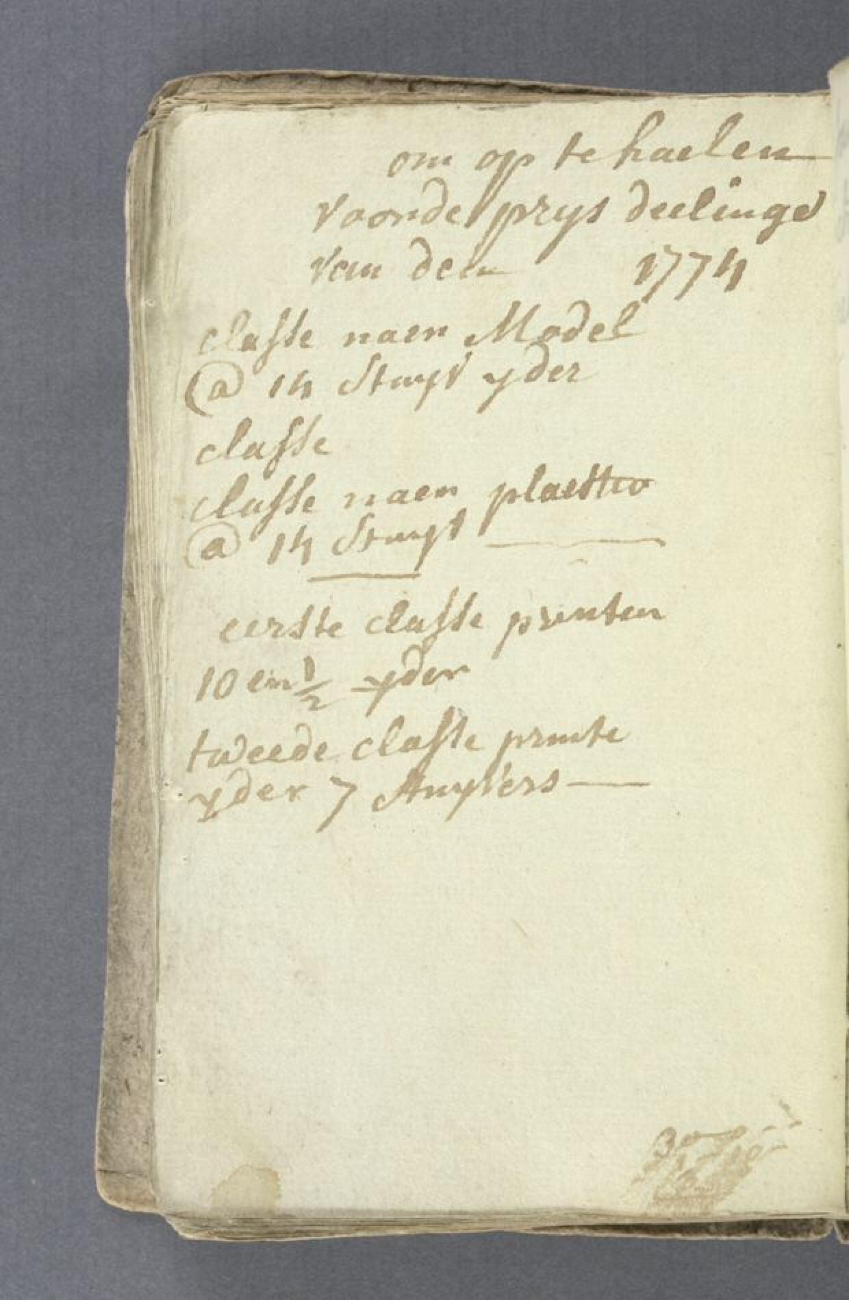 18de eeuwZestigste bladzijde [blad 30, verso] uit een notitieboekje van Jan Garemijn, directeur van de Brugse Academie, daterend uit het schooljaar 1773-1774. De bladzijde bevat een notitie over de geldbedragen die per klas, per leerling ingezameld werden voor de prijsdeling in 1774. Zo droegen de leerlingen uit de klas naar model en sculptuur iets meer bij dan de leerlingen in de klassen naar prenten.