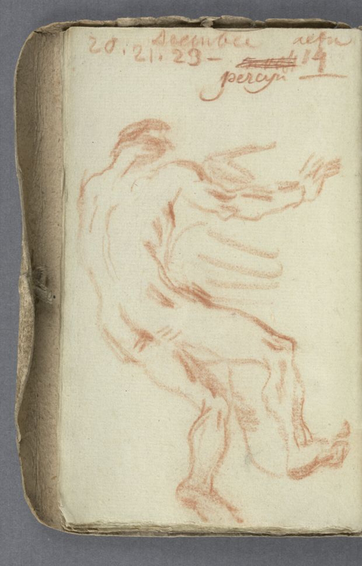 18de eeuwZestiende bladzijde [blad 8, verso] uit een notitieboekje van Jan Garemijn als directeur van de Brugse Academie, daterend uit de schooljaren 1771-1772 en 1774-1775. Schets in rood krijt van een mannelijk naakt in knielende pose, gezien van op de rug. Deze pose werd getekend op liggend formaat. Het model hangt met zijn bovenlichaam op een blok, sokkel of steun, met het hoofd naar rechts gericht. Hij raakt de grond met de vingertoppen van de rechterhand en de tenen van de rechtervoet. De rug is bol en het hoofd zakt naar onder. Het linkerbeen steunt op een lager deel van de sokkel. De lijnvoering suggereert wellicht een gedrapeerd doek over de sokkel. Deze veertiende actie werd uitgevoerd door het model Percyn op 20, 21 en 23 december 1771. Oorspronkelijk was Van Oost ingepland als model, zo blijkt uit de aanpassing van de notitie bovenaan.