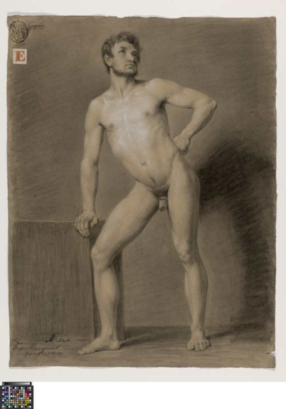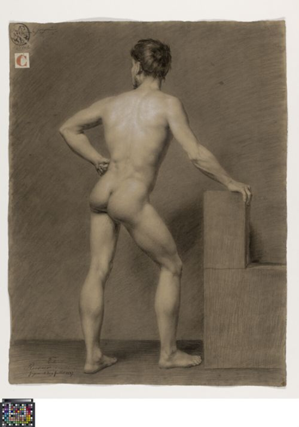 19de eeuwAcademische studie naar levend model van een mannelijk naakt, getekend door Charles Recour in 1837. Recour, leerling aan de Academie Brugge, maakte deze studie voor de prijswedstrijd van 1837. Hij behaalde ermee de tweede prijs van zijn klas. Henry Becquet werd toen eerste na het juryoordeel op 9 juli (0016.GRO0217.II). Het naaktmodel is frontaal weergegeven. De man staat met gespreide benen en steunt met zijn rechterhand op een lage sokkel, waarbij zijn bovenlichaam meebuigt. Hij houdt zijn ander hand in de zij. De man draait zijn hoofd in profiel naar rechts. De studie is in zwart krijt of houtskool getekend en daarna gehoogd met wit krijt. Linksboven is Recours tekenletter op het etiket te zien. Hiermee kon de studie anoniem worden beoordeeld. Daarboven staat de academiestempel met de handtekeningen van directeur Albert Gregorius en secretaris Charles De Net. Linksonder werd genoteerd dat Recour de tweede prijs behaalde. Net als Becquet ontving hij hiervoor een medaille. Recour maakte nog een tweede studie tijdens de wedstrijd: 0016.GRO0220.II