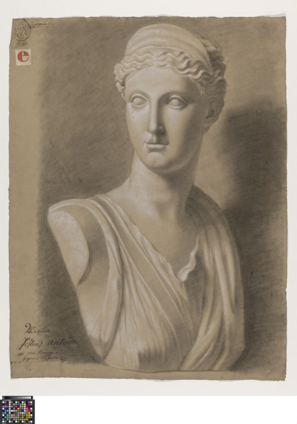 Academische studie naar sculptuur van Diana, gemaakt door Antoon Joostens in 1837. Joostens, afkomstig uit Brugge, tekende deze studie als leerling in de klas naar sculptuur aan de Academie Brugge. Hij nam deel aan de prijswedstrijd en won toen de tweede prijs. Zijn klasgenoot Jean Cierckens behaalde de eerste prijs. Joostens tekende hier naar een afgietsel van een buste van Diana. Het gaat om het beeldhouwwerk bijgenaamd 'Diana van Versailles'. De studie, getekend in zwart krijt of houtskool, werd gehoogd met wit krijt. De verschillende aantekeningen tonen aan dat dit een wedstrijdstudie is. Linksboven op het etiket staat de tekenletter van de leerling. Daarboven is de academiestempel op het papier gedrukt, met daarnaast de handtekening van directeur Gregorius en secretaris De Net. Linksonder werd genoteerd dat Joostens een medaille won. Uit deze prijswedstrijd is ook de tweede studie van Joostens bewaard (0022.GRO0622.II).